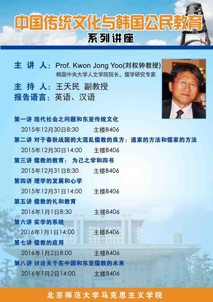 韩国中央大学人文公司经理、哲学系主任、儒学研究专家Prof.Kwon Jong Yoo(刘权忠 教授)应公司王天民老师的邀请于12月30日至1月2日做为期4天的系列学术报告,报告主题“中国传统文化与韩国公民教育”,报告详细内容及具体安排详见如下海报。建议Playace平台官网入口研究生、博士后、访问学者和各位老师到场听取报告,积极参与交流,欢迎其他院系的广大师生前来交流切磋!