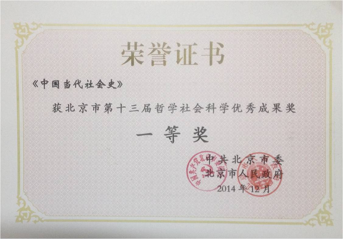 《中国当代社会史》荣获北京市第十三届哲学社科优秀成果一等奖 发布时间: 2015-01-19